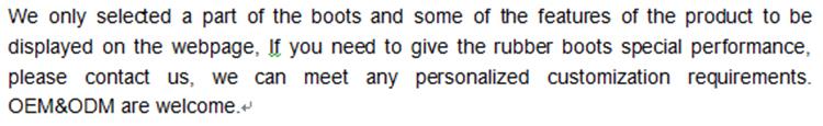 Bòt yo 100% ki enpèmeyab, izolasyon ak chalè, ak pwoteksyon bouchon asye-zòtèy. Kawotchou lou ak sèl dansite segondè, neoprene aliyen andedan pou izolasyon ak chalè.